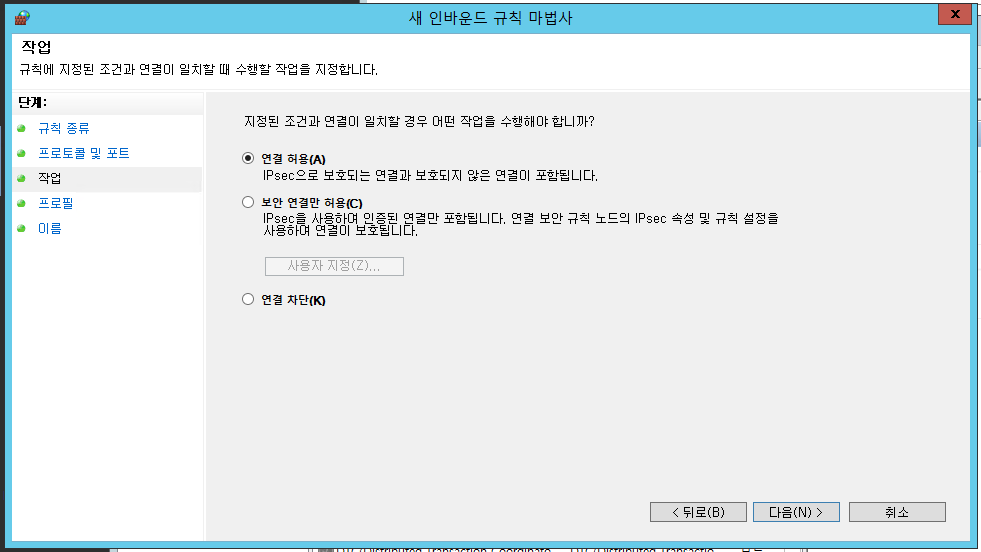 [Windows 방화벽] > [고급 설정] > [인바인드 규칙] > [새 규칙] 으로 들어가 규칙을 추가합니다.