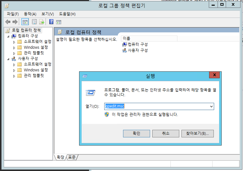 [Win] + [R] 으로 실행을 실행해서 gpedit.msc를 입력해 로컬 그룹 정책 편집기를 실행합니다.