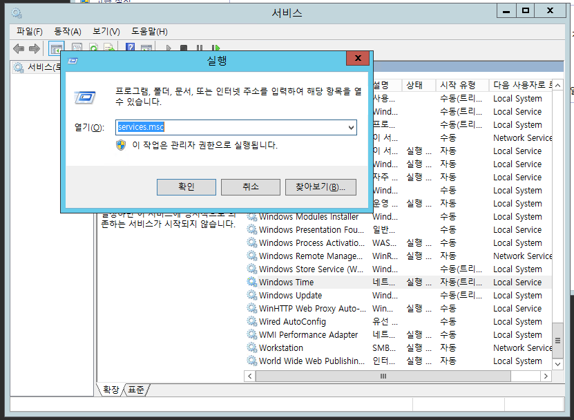 실행에서 services.msc을 입력해 서비스를 실행합니다.