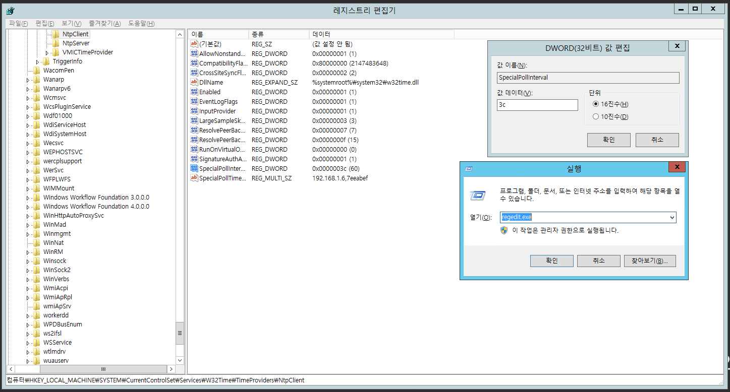실행에서 regedit.exe를 입력해 레지스트리 편집기를 실행 후 HKEY_LOCAL_MACHINE\SYSTEM\CurrentControlSet\Services\W32Time\TimeProviders\NtpClient\SpecialPollInterval 값을 원하시는 동기화 주기로 입력합니다. (초 단위)
