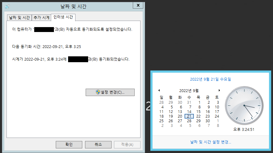 마지막으로 Windows 시간에서 [날짜 및 시간 설정 변경] > [날짜 및 시간] > [인터넷 시간] > [설정 변경]을 클릭합니다.