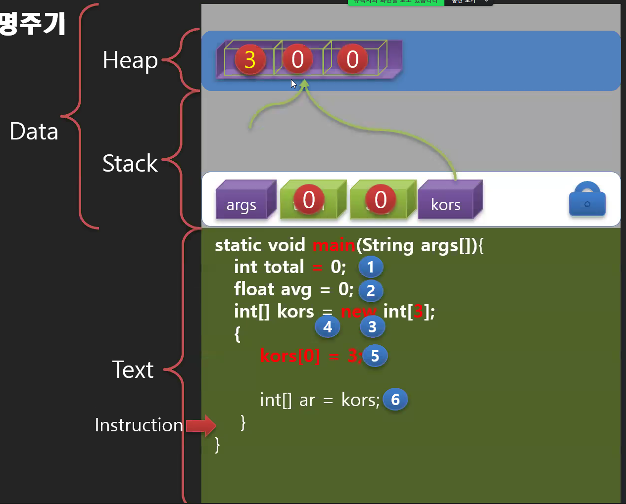 stack영역에 준비물 args, total, avg, kors (보라색은 참조변수, 초록색은 일반변수) 블록 들어가기 전에 예약석에 넣은 느낌이다. 그리고 자물쇠로 봉인.